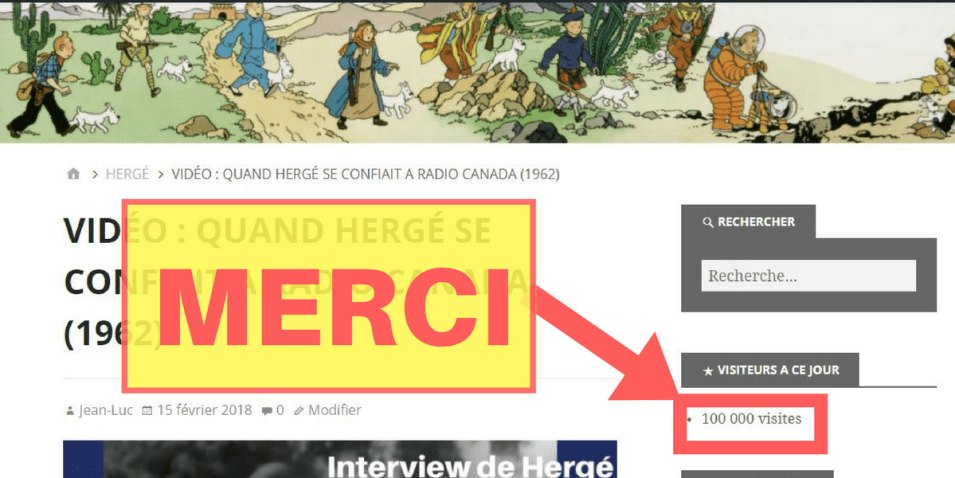 À Toutes et à Tous, je vous dis BRAVO ! Et je devrai même ajouter FÉLICITATIONS ! Pourquoi ? Pour une raison bien simple : Hier soir, jeudi 15 février, à 23h, j’étais devant mon écran en train de tintinasser et soudain un nombre à 6 chiffres s’est affiché : 100 000….