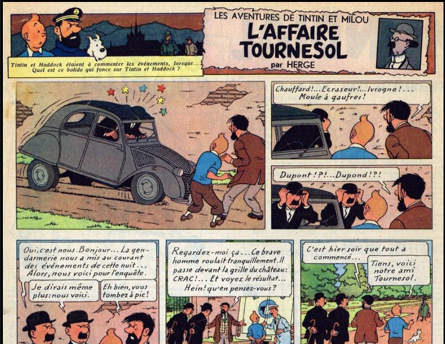 En 1955, dans le journal Tintin du 9 mars, les Dupontd font une entrée remarquée dans l’Affaire Tournesol au volant de leur 2 Chevaux Citroën. Belle image, très dynamique et très drôle. Et ce pour la plus grande joie des « Tintinophiles Citroënistes ». Et il y en a beaucoup…