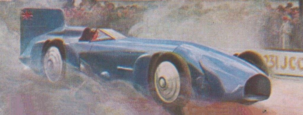 Hergé y fera d’abord allusion une première fois dans le Petit Vingtième du 21 mars 1935, dans Le Lotus Bleu, lors de la séquence où on voit Tintin, réfugié dans une salle de cinéma de Shanghai, découvrant aux Actualités Mondiales que le Britannique Sir Malcolm Campbell a une fois de plus battu le record mondial de vitesse automobile à bord de son Blue Bird.
