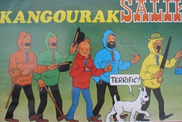 Vers la fin de l’année 1979, le Studio Hergé (via l’agence Publiart) accepta une proposition de publicité du fabricant de vêtements néerlandais AGU pour son manteau de pluie (façon Kway) commercialisé sous le nom de Kangourak Salik.
