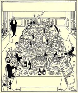 Nul doute que pour cette superbe illustration, Hergé s’est certainement « inspiré » des pantagruéliques banquets que Raymond Leblanc (Directeur du Journal Tintin) organisait une fois par an à l’Auberge du Château de Beersel (ambiance typiquement breughélienne) pour le déjeuner de fin d’année des dessinateurs du journal.