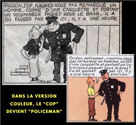 - Les autres détails que le dessinateur élimina impitoyablement n’étaient pas réellement des erreurs mais plutôt des incongruités contrevenant à ce style hergéen qui se dégageait peu à peu. Dans la version noir et blanc, on trouve encore, notamment, des « impuretés » empruntées à d’autres arts tels que les effets optiques inspirés du cinéma. Dans la version en couleurs, Hergé les supprimera systématiquement, s’efforçant d’approcher de plus en plus près les spécificités de la bande dessinée.