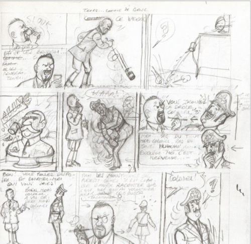 La première étape est tout naturellement de trouver un scénario, le plus simple possible, pour poser les bornes de l’histoire à raconter. Le découpage graphique vient par la suite développer et enrichir ce scénario. A ce stade, Hergé dessine sommairement l’enchainement des cases en s’assurant de mettre un point d’orgue à la fin de chaque page. Les dialogues et les personnages sont dessinés très rapidement, sans les décors. C’est donc à cette étape que l’histoire prend sa forme. Laissons parler Hergé : « Une fois le scénario mis au point, je procède au découpage page par page, sur des petites feuilles où je griffonne des croquis. Et ça, c’est le travail le plus difficile, parce qu’il faut un suspense ou une chute à la fin de chaque page. Et si, par exemple, arrivé à la page 42, je trouve une meilleure idée pour la page 15, tout est à recommencer depuis la page 15 !… Un travail d’horloger, je vous assure. D’horloger ou de bénédictin. Ou d’horloger bénédictin…«