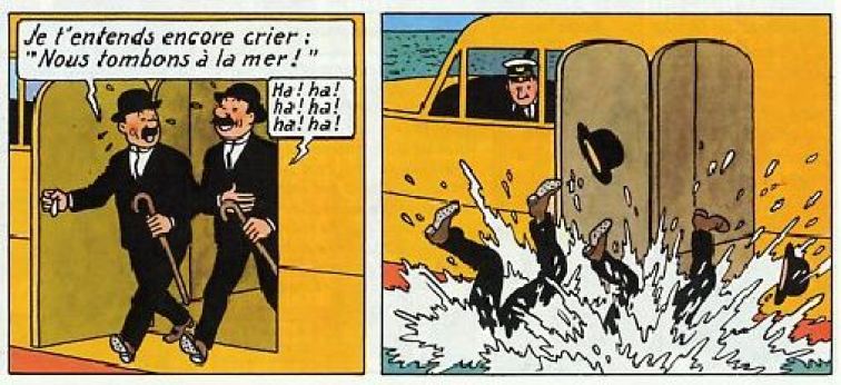 En ce qui concerne ce dernier gag, Hergé s’est inspiré d’une histoire vraie qu’il avait consignée dans ses notes sous l’intitulé « Histoire Grecque » : « Général inspecte flotte aérienne, il pilote hydravion. Distrait, veut atterrir sur le terrain d’aviation, Le commandant lui fait observer son erreur. Amerrît. Félicite le commandant et le remercie pour le tact avec lequel il lui a fait observer sa distraction. Ouvre la porte…et tombe à la mer ! ».