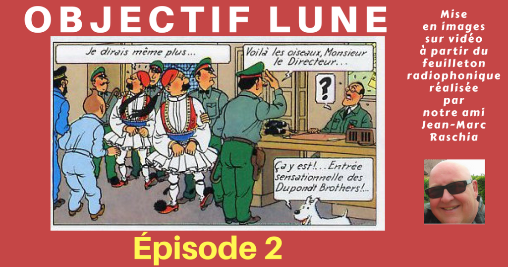 Partant du podcast du feuilleton radiophonique « OBJECTIF LUNE » diffusé en 1960 par la Radio Télévision Française, Jean-Marc RASCHIA a réalisé, en vidéo, une « mise en image » à partir des cases de l’album couleurs. Une semaine calme s’est écoulée quand brusquement une nuit l’alerte est donnée : un avion survole la zone interdite. Il ne répond pas au central et fait croire qu’il est endommagé, tandis que trois parachutistes sautent de l’avion, dissimulés par la nuit et les nuages. Le central ordonne à la DCA d’ouvrir le feu. Brusquement réveillés, Tintin et Milou se précipitent vers la chambre de Tournesol d’où provient l’explosion. Stupéfaits ils découvrent le professeur toujours endormi dans son lit, projeté à travers le mur à l’extérieur de sa chambre sur des fils électriques qui l’ont retenu. Le lendemain matin, Monsieur BAXTER a convoqué tout le personnel pour les informer : un des parachutistes est mort, les deux autres sont en fuite. Le téléphone sonne pour annoncer la capture de ces deux hommes, des espions grecs…
